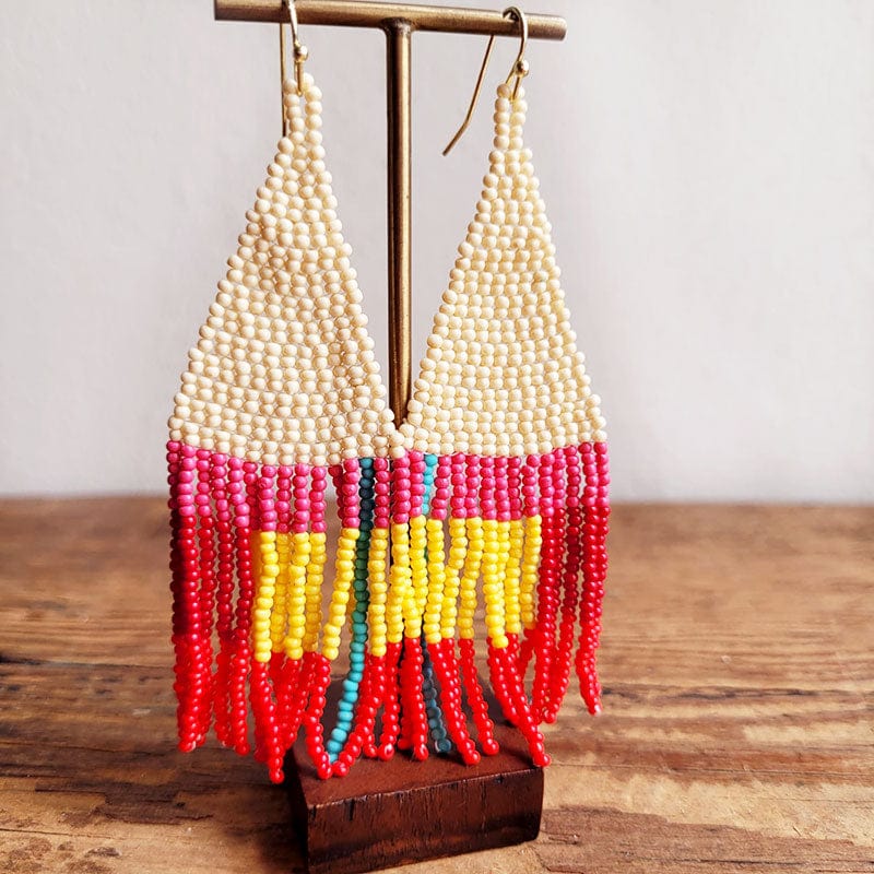 This is a lovely pyramid shaped beaded earring bright, fun and vibrant, these beautiful beaded earrings will liven up any outfit. The tiny glass seed beads are threaded by hand by our artisan partners and fixed with a contemporary arched earring hook.