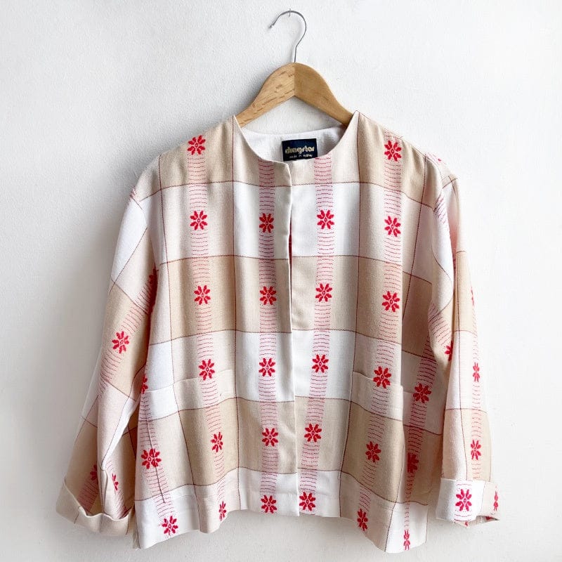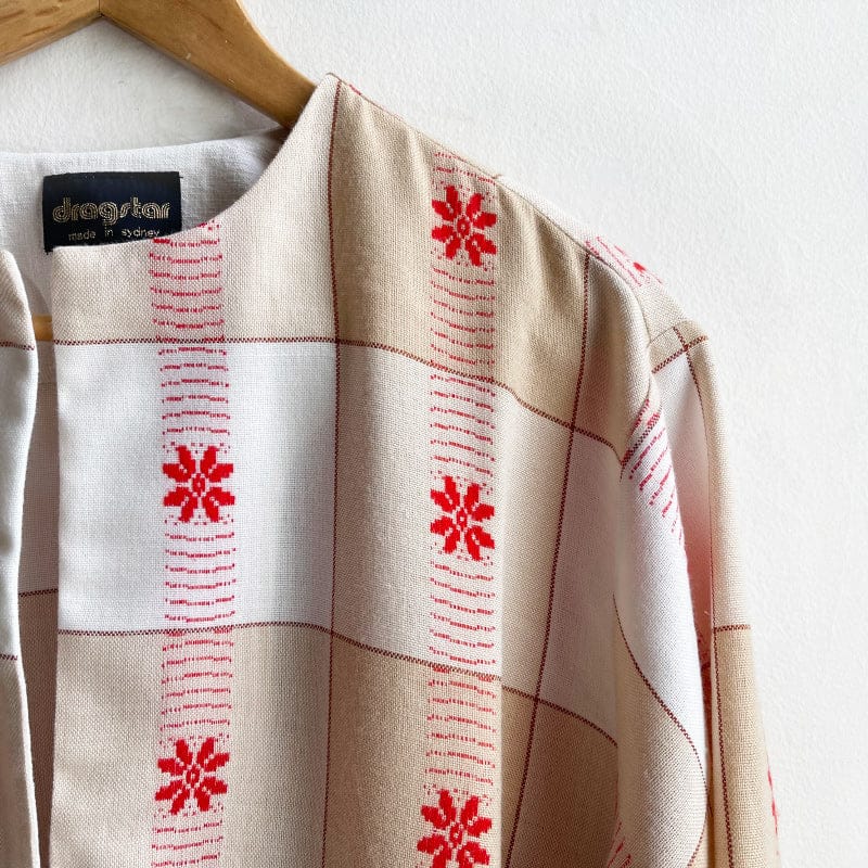 Vintage Fabric Boxy Jacket LARGE Check with Red Flowers